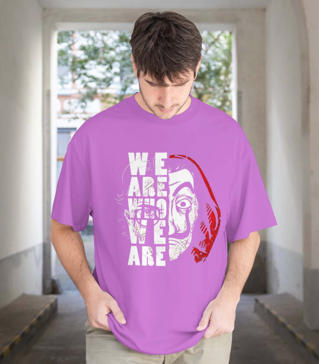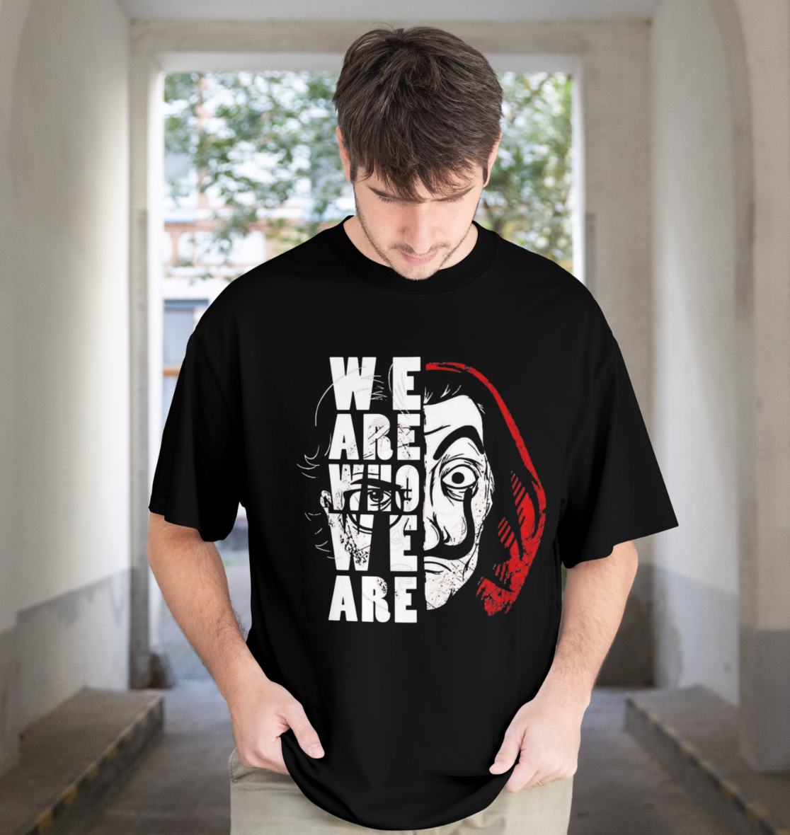 Stylish black T-shirt featuring the iconic Dali mask and bold “We Are Who We Are” text. Perfect for fans of mystery, rebellion, and statement fashion.
