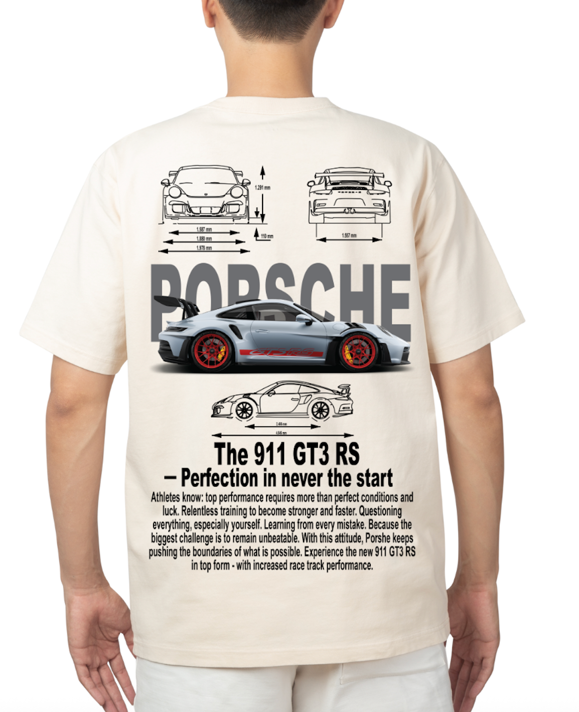 Unleash the spirit of motorsport with the Porsche 911 GT3 RS Precision Tee. This cream-toned t-shirt captures the essence of Porsche’s high-performance legacy, featuring detailed blueprint diagrams and a striking graphic of the 911 GT3 RS in profile with red performance wheels. Below, an inspiring message highlights Porsche’s relentless pursuit of perfection through resilience and precision engineering. With dimensional schematics and bold typography, this shirt is perfect for track-day enthusiasts and Porsche fans alike.